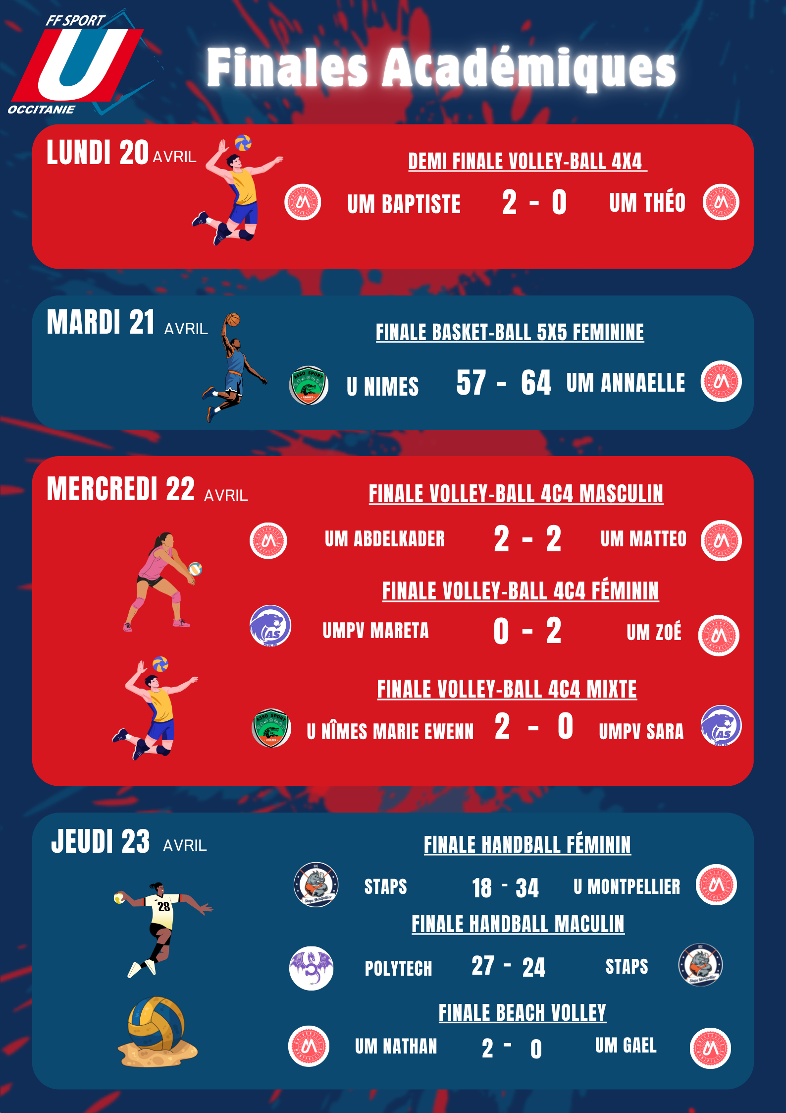 Retrouvez les résultats complets des finales académiques de la FFSU Occitanie du lundi 20 au jeudi 23 avril. Entre duels acharnés sur les parquets et compétitions sur le sable, nos étudiants-athlètes ont tout donné pour décrocher les titres de champions académiques 2026 !